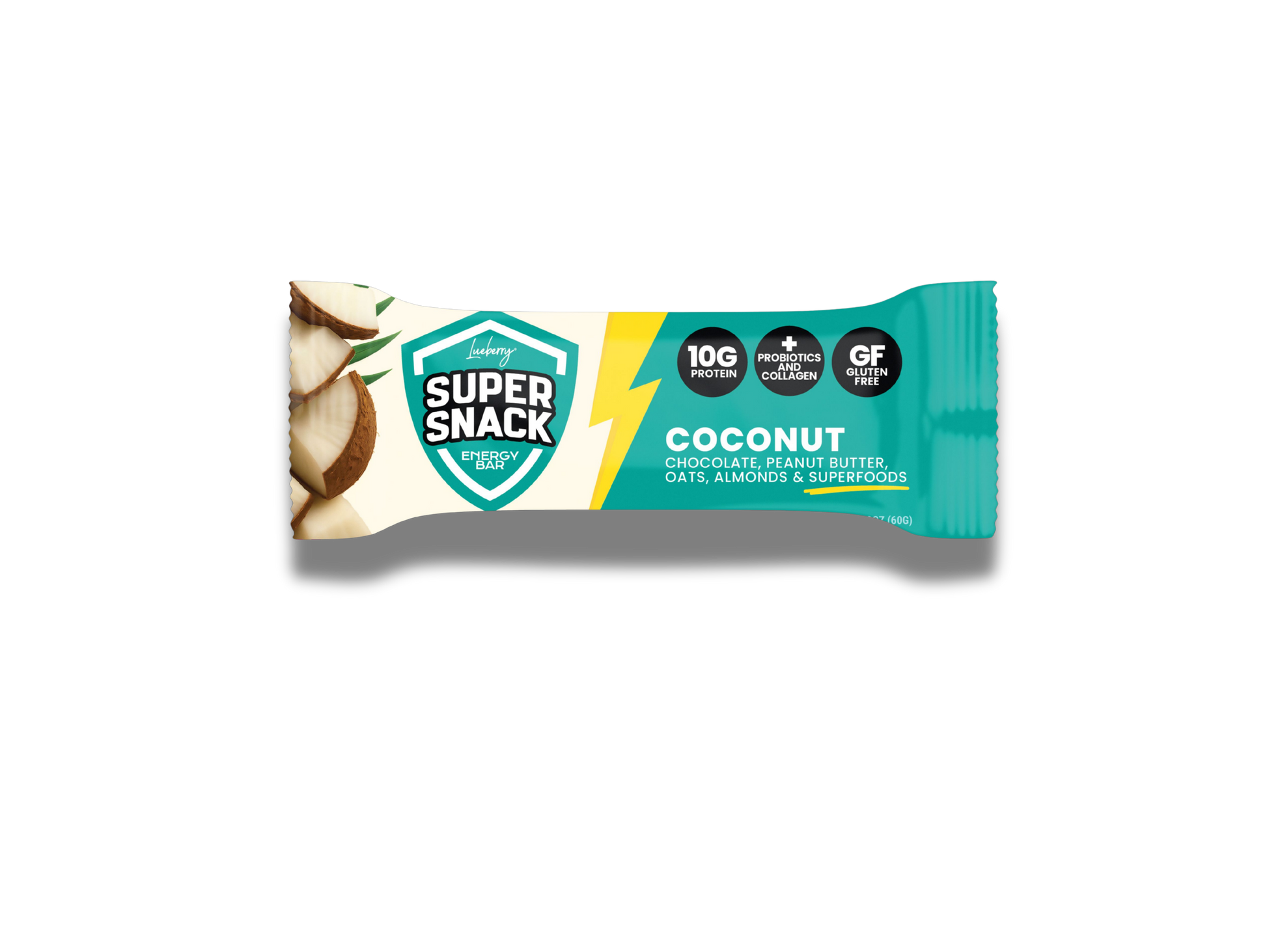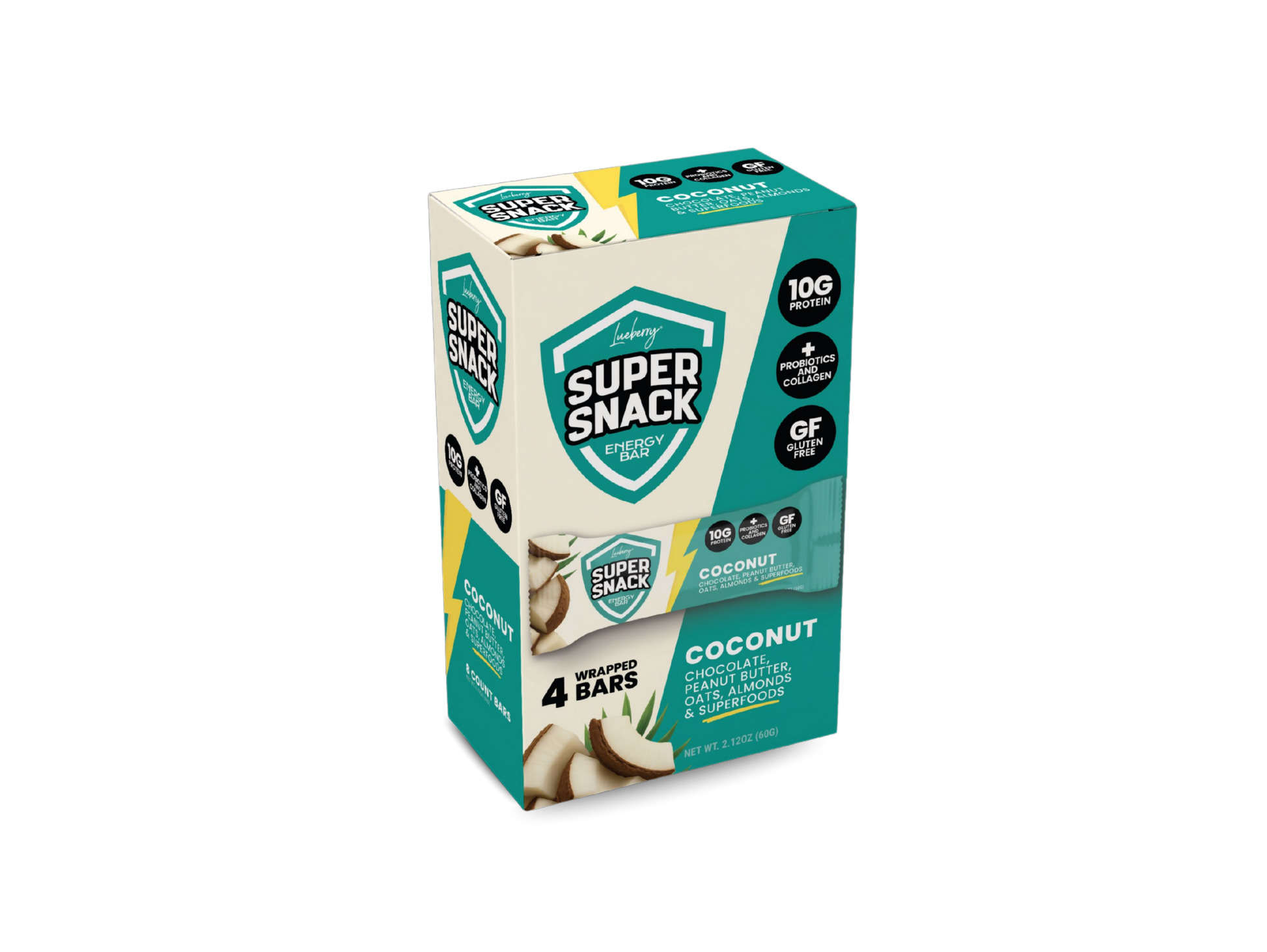 Chocolate Coconut Super Snack Energy bar has 10 grams of protein, collagen, probiotics, are gluten-free and have a chocolaty no bake cookie taste and texture that make Super Snacks the bar you will want every day.