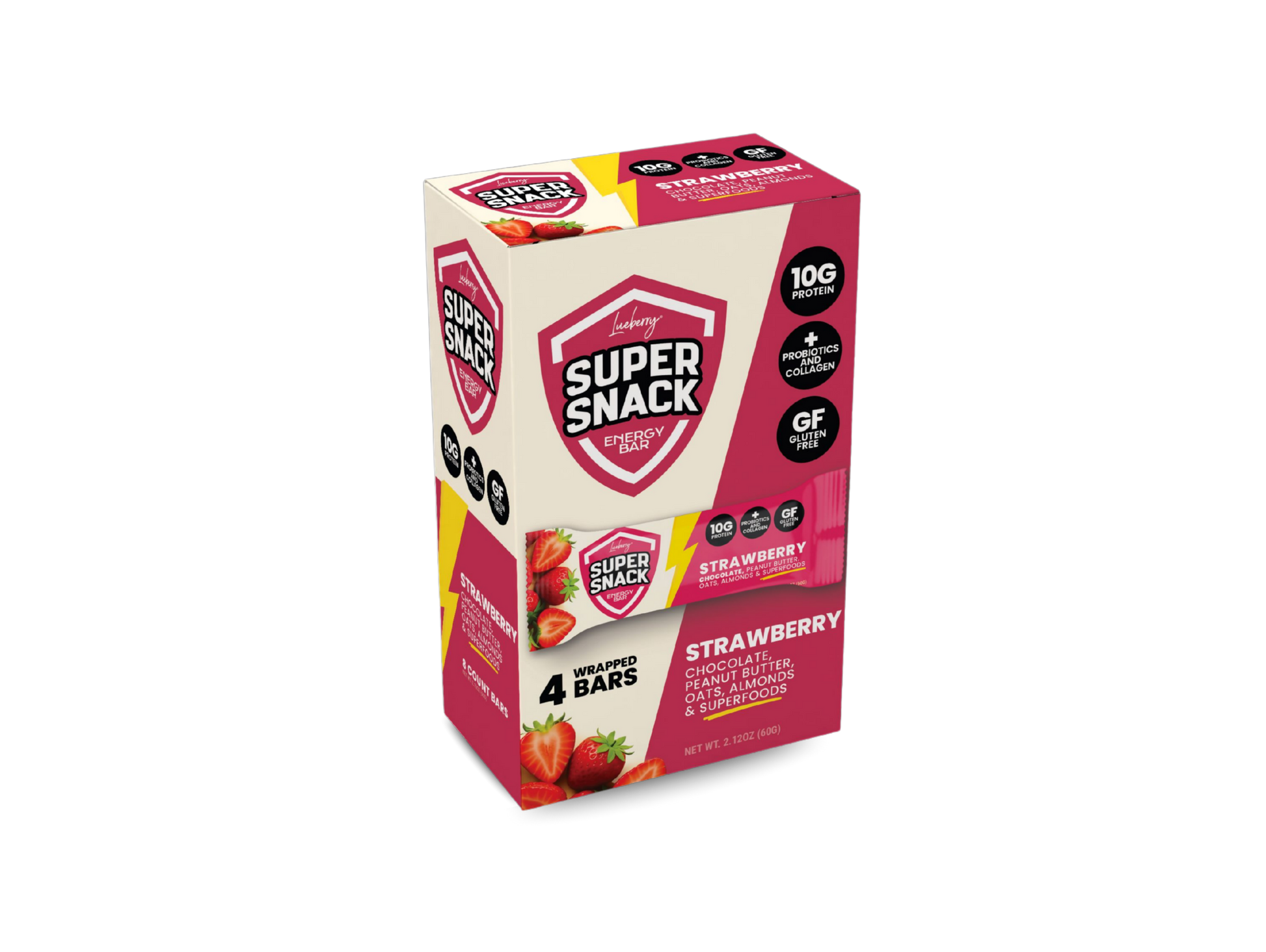 Strawberry Super Snack Energy bar has 10 grams of protein, collagen, probiotics, are gluten-free and have a chocolaty no bake cookie taste and texture that make Super Snacks the bar you will want every day.