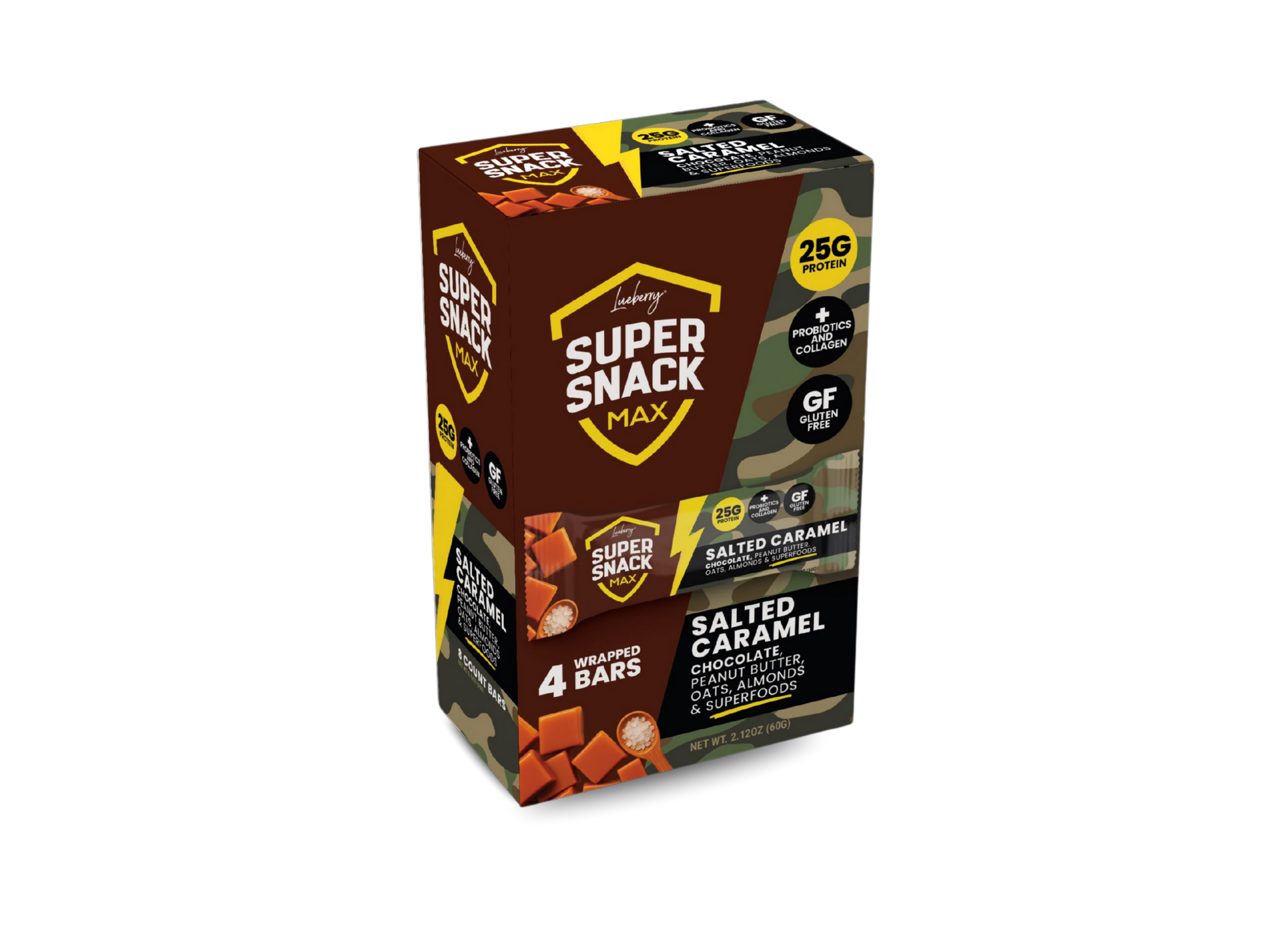 MAX Salted Caramel Super Snack Energy bar has 25 grams of protein, collagen, probiotics, are gluten-free and have a chocolaty no bake cookie taste and texture that make Super Snacks the bar you will want every day.